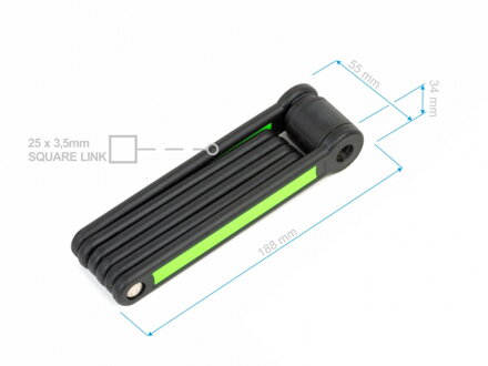 • Obvod: 840 mm, rozměr ve složeném stavu 188x55x25 mm (průměr hlavy zámku 34 mm).